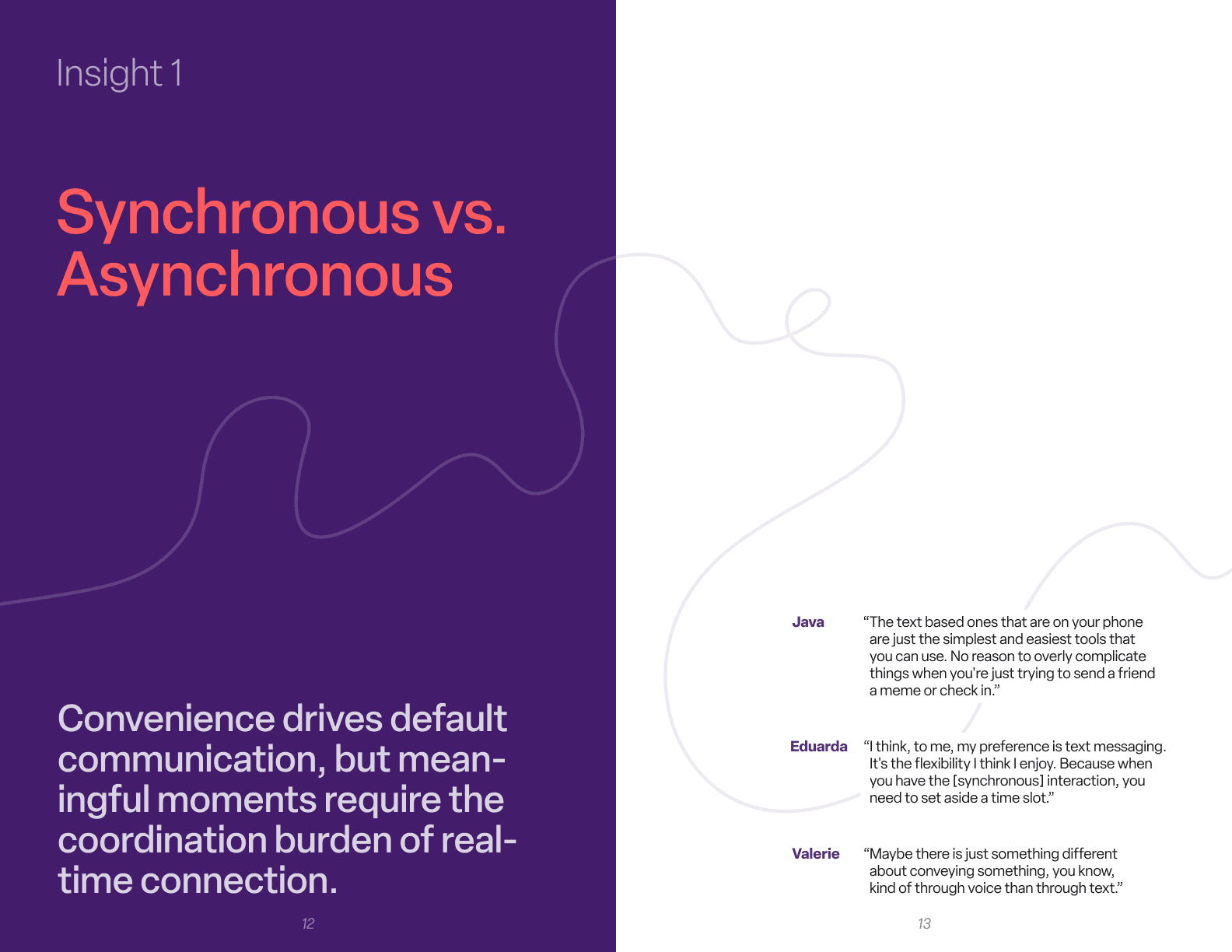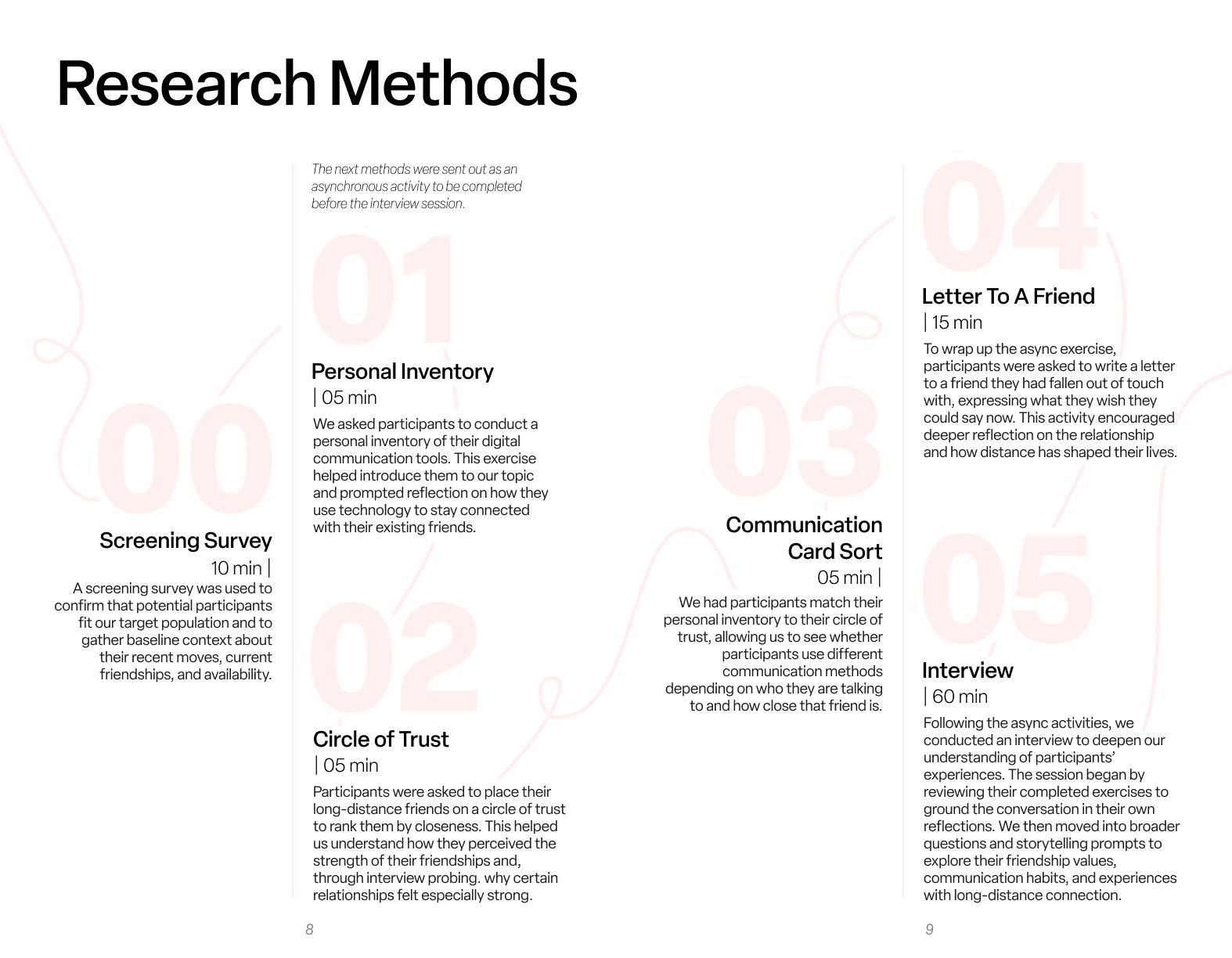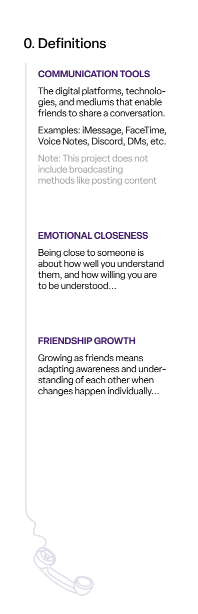 In the second half of the interview, we explored friendship values, moments of connection and tension, and how authenticity shows up across distance. Participants also completed a short talk-aloud exercise using both familiar and less familiar communication tools to reveal real-time behaviors, instincts, and emotional responses.
