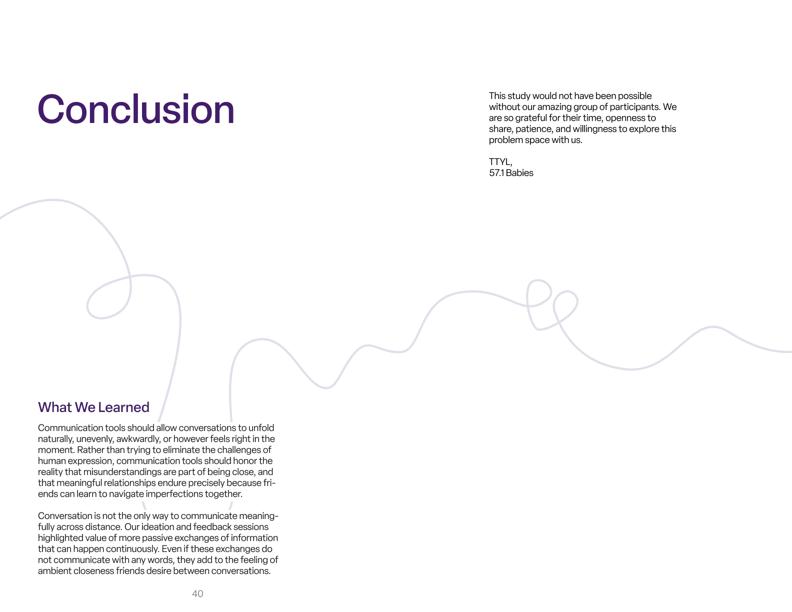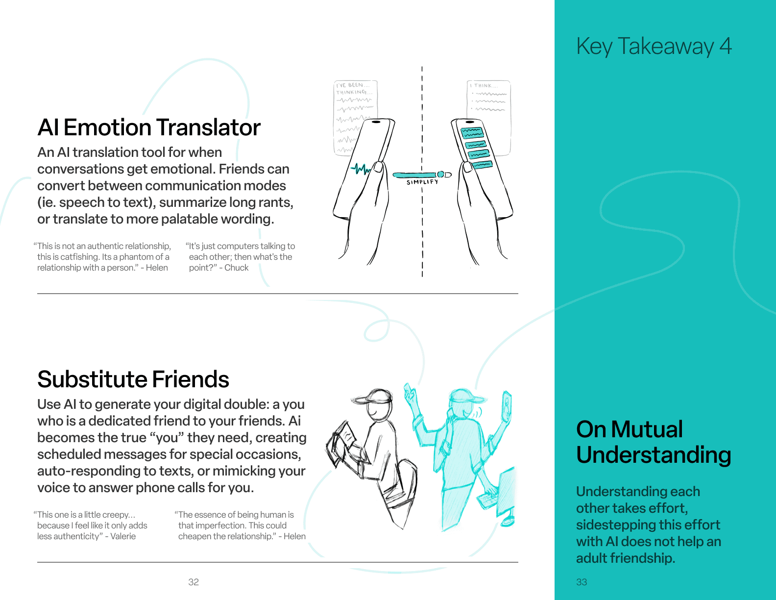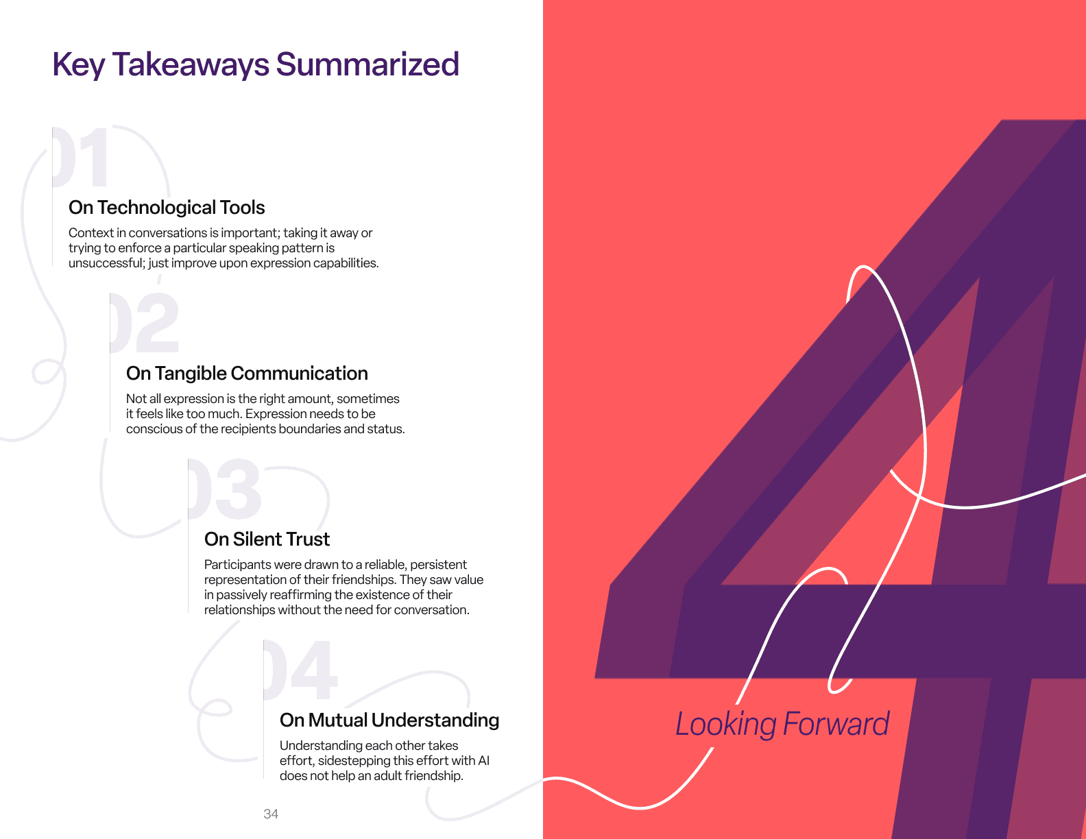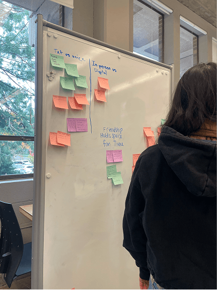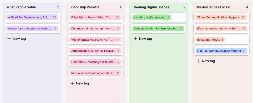 We coded every transcript, tagging quotes across themes such as communication habits, friendship dynamics, emotional boundaries, digital challenges, and contextual circumstances. These tags were then grouped, sorted, and re-sorted as we looked for patterns, tensions, and emerging principles.