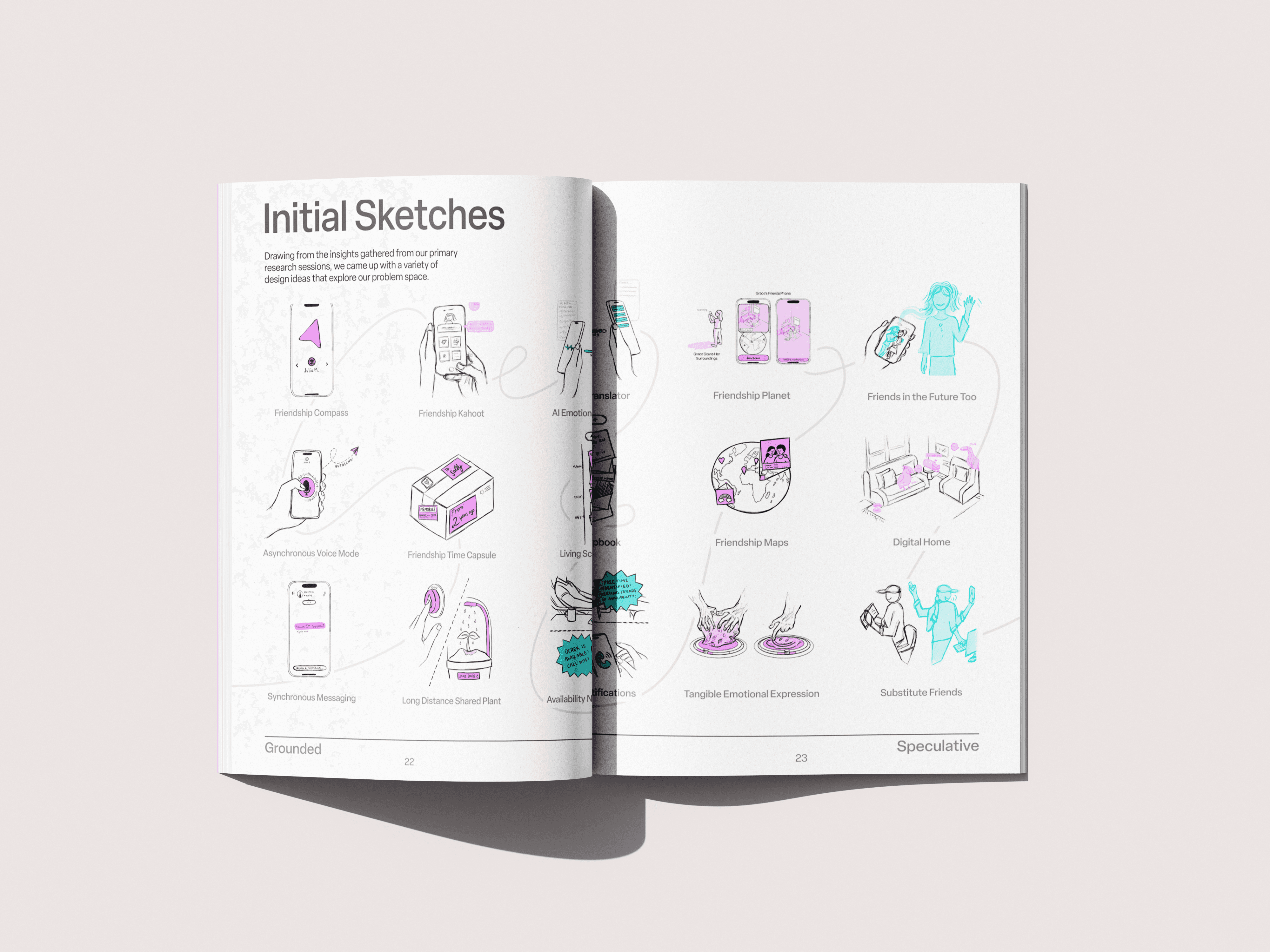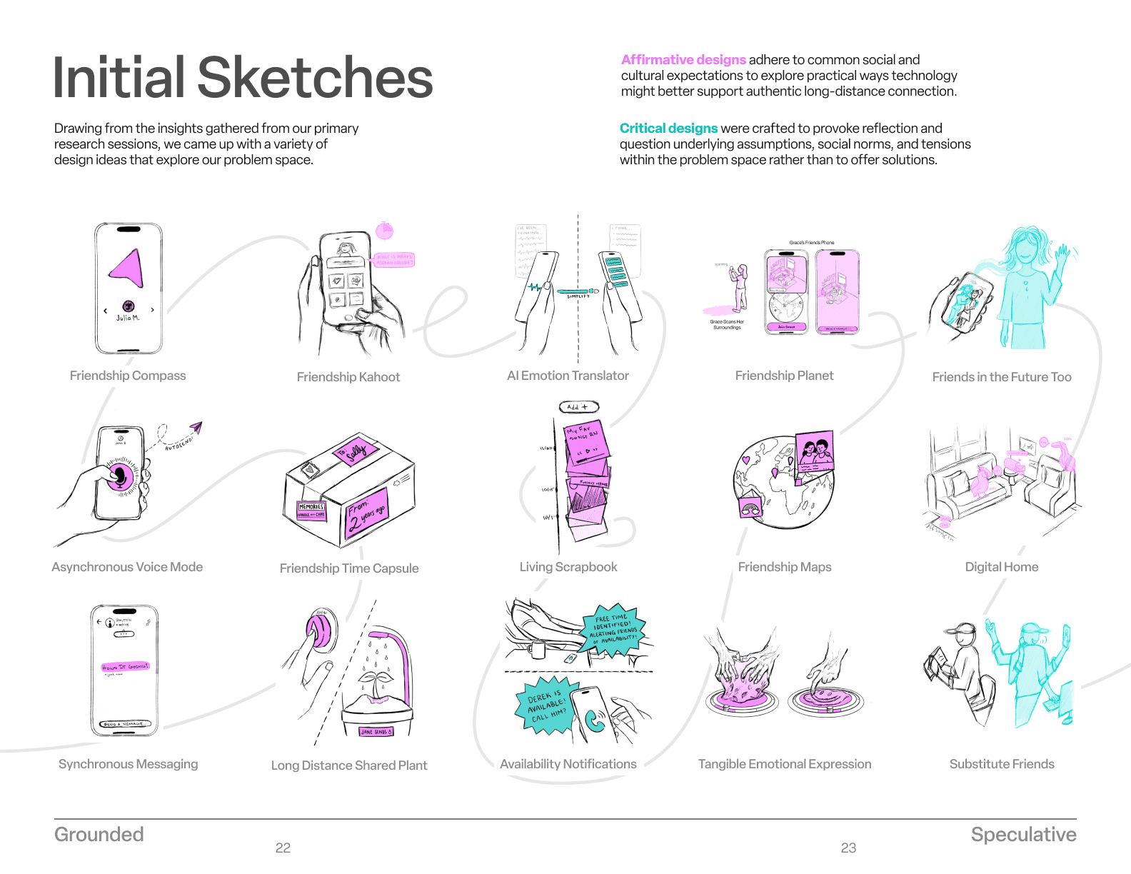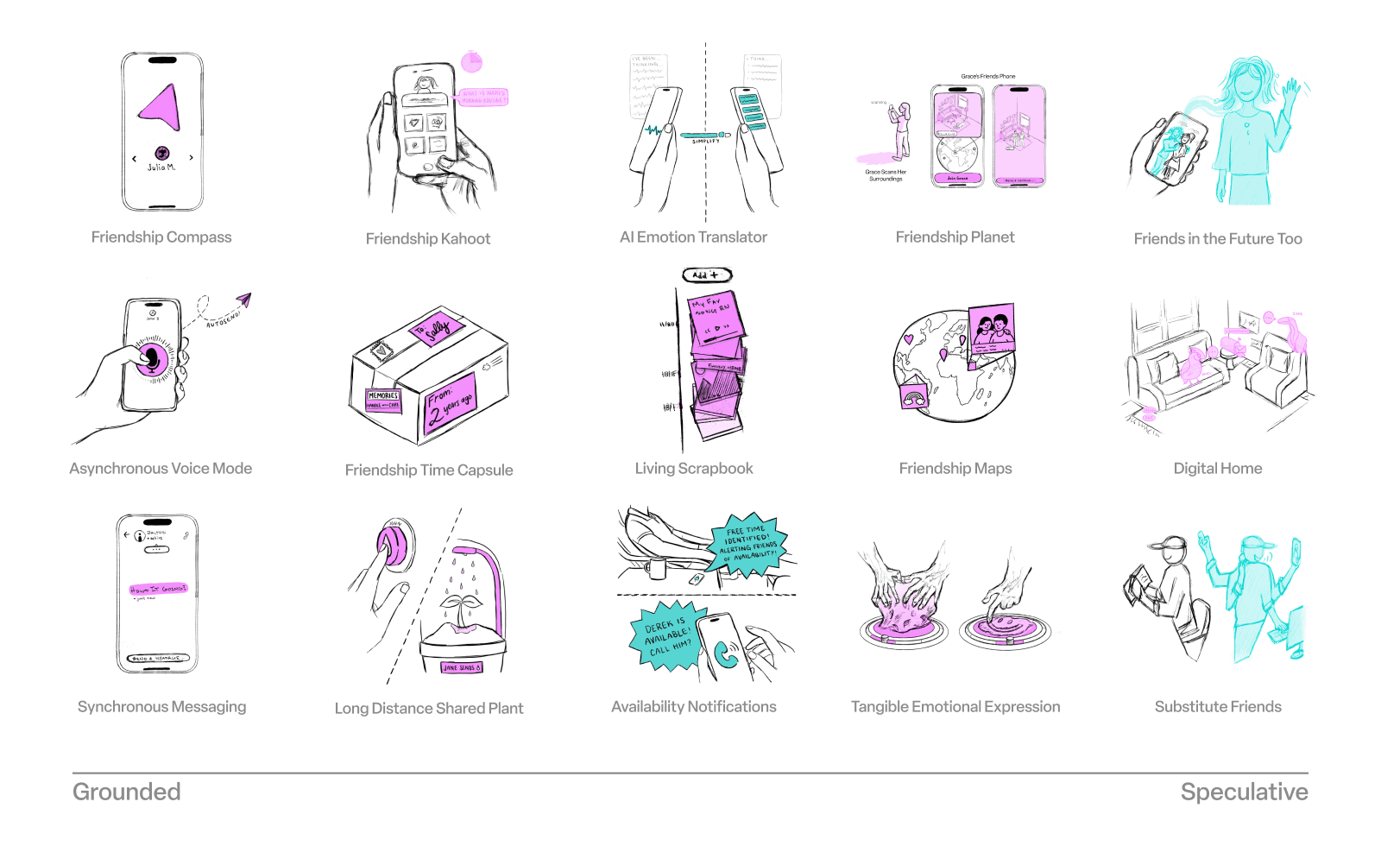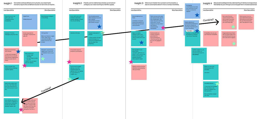 We sorted each idea by the insight it aligned with and selected 15 concepts we felt were the most promising, challenging, or conversation-sparking. These became our first round of sketches, visualizing how future communication tools could respond to the emotional and relational realities we uncovered in research.